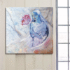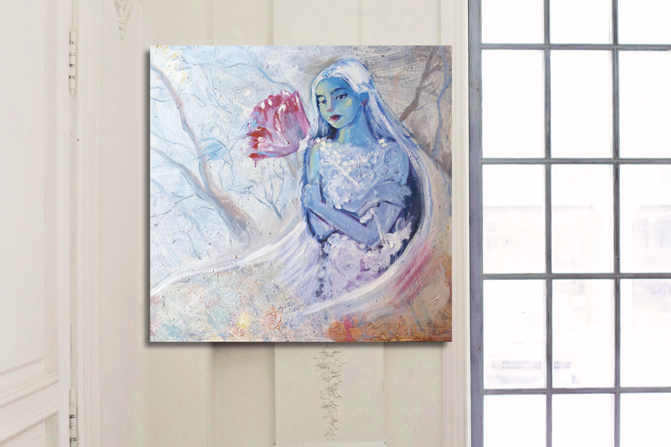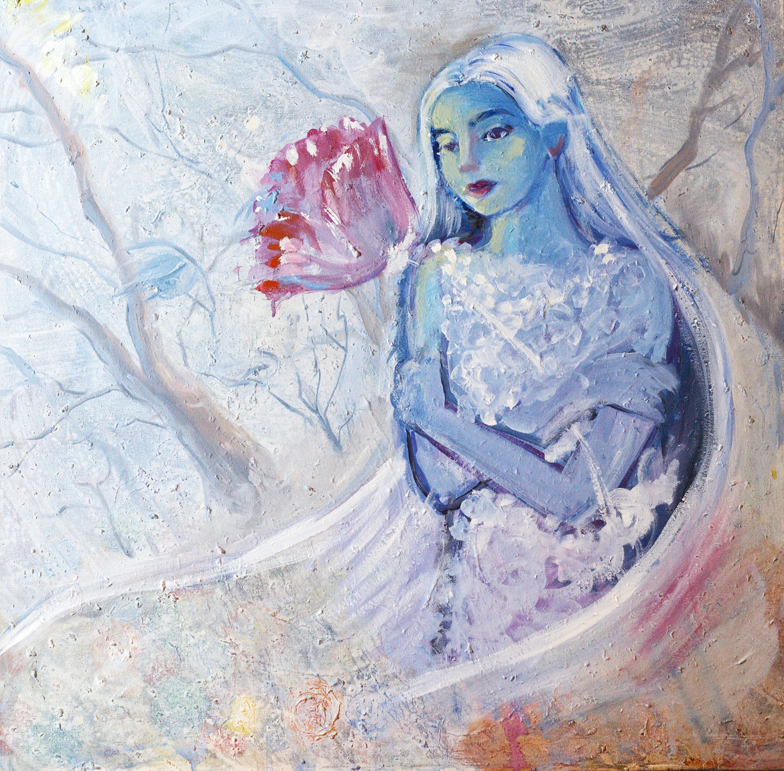 A lone female figure stands amidst a soft, wintry landscape. Her gaze holds quiet strength and anticipation for spring’s return. The single red rose in her hand, painted in muted tones, becomes a symbol of warmth and memory — the last ember of life she carries within the hush of winter.