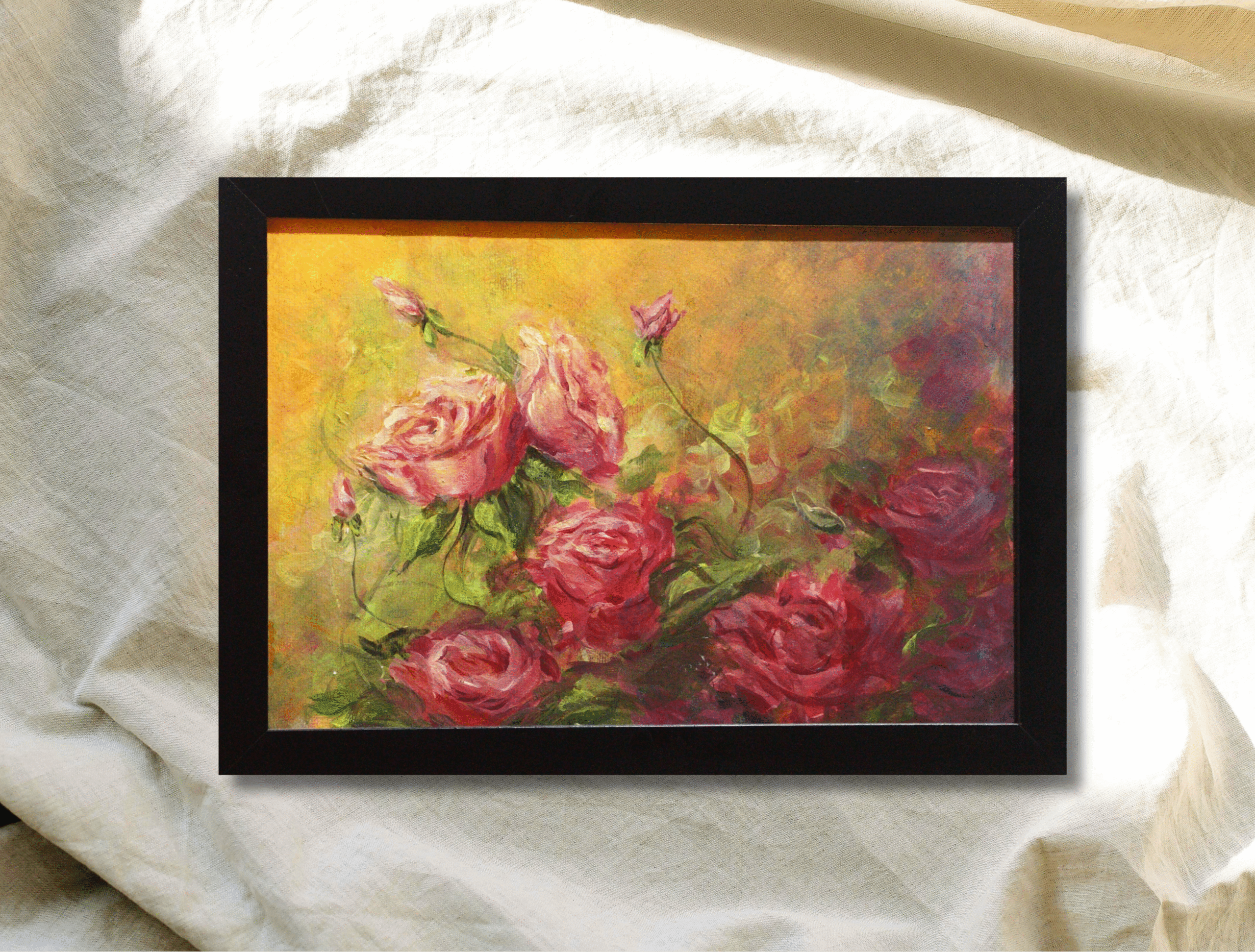 This floral study highlights the timeless elegance of red roses, their rich crimson petals symbolizing love, passion, and warmth. The delicate brushwork and vibrant tones bring the roses to life, making this piece a radiant centerpiece for any space.