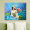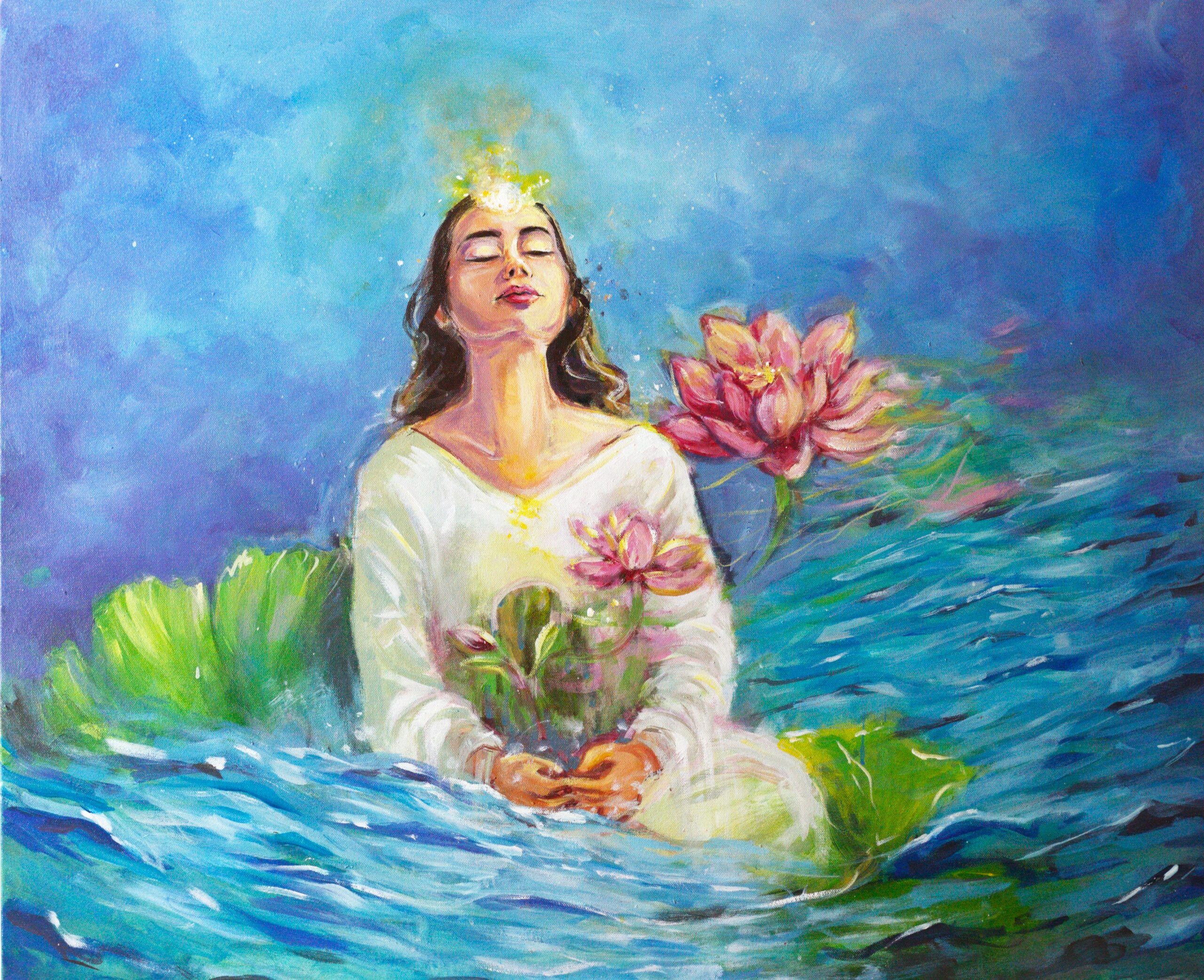 A woman sits in tranquil water, surrounded by fluid, organic textures. From her chest emerges a lotus, symbolizing purity and awakening, while soft light radiates from her head, capturing a moment of spiritual clarity and peace.