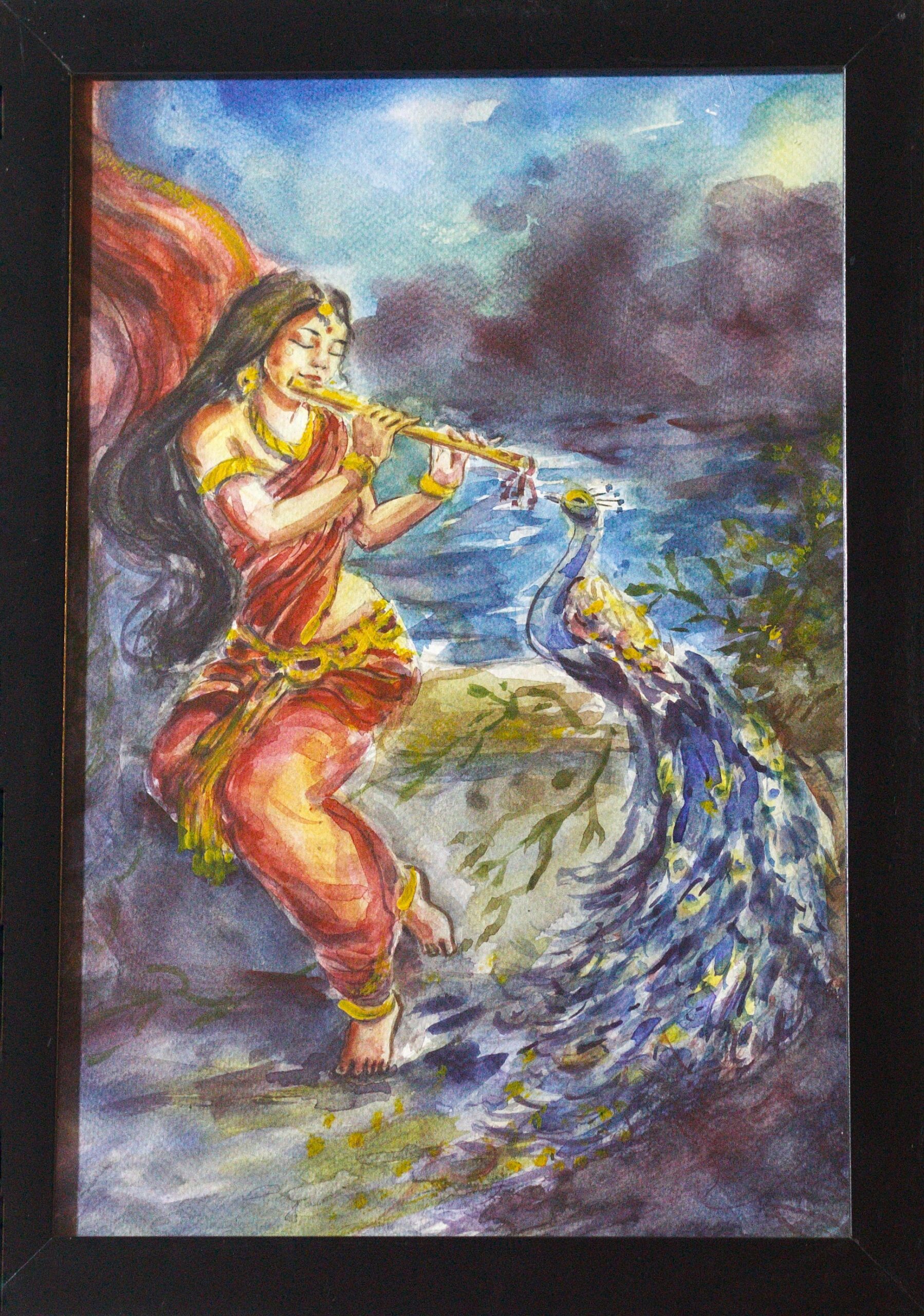 This watercolor artwork captures an enchanting moment: a woman draped in flowing Indian attire plays the flute under a softly hued sky of blues and purples, while a peacock rests nearby, listening with quiet grace. The scene carries the freshness of rain and the charm of Indian tradition, bringing together nature, music, and serenity in one frame.