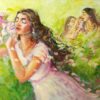 Lingering Scents explores how fragrance carries memory — a fleeting aroma that revives moments long past. The painting portrays a woman holding a flower close, her expression softened by remembrance. As she inhales the fragrance, her mind drifts to a tender memory of her mother — both surrounded by the same blossoms in a sunlit garden.