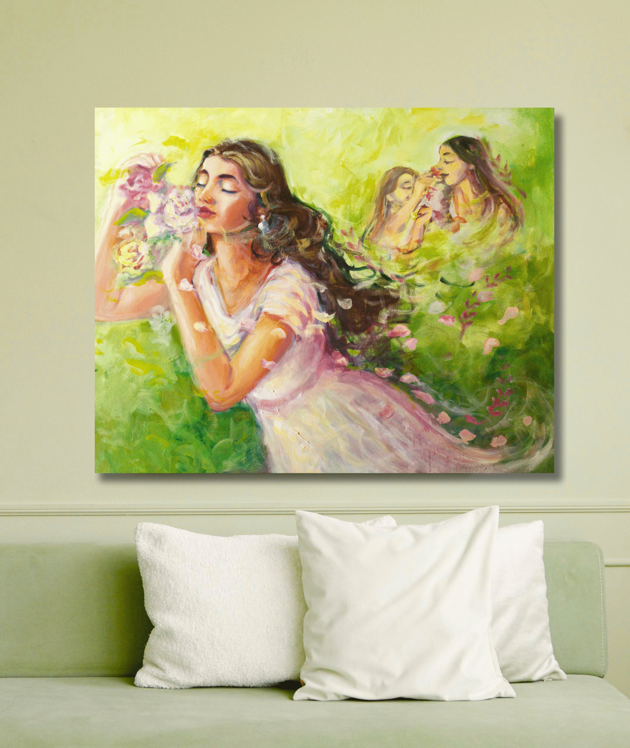 Nature and femininity intertwine throughout the work: gentle strokes, organic colors, and soft light evoke peace, emotion, and continuity between past and present. The painting reminds viewers that scent, though invisible, is one of the strongest ties to love and memory.
