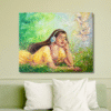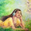 Sound of Nature explores the beauty of listening — not just with ears, but with awareness. The painting portrays a woman lying amidst a lush garden, dressed in a vibrant yellow attire, lost in a tranquil moment. Her headphones connect to the birds around her, blending human-made music with the symphony of nature.